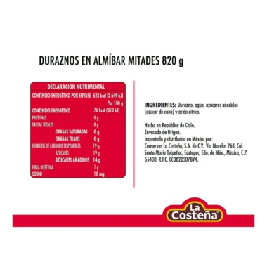 Lata de duraznos en almíbar en mitades de 820 g de La Costeña®.