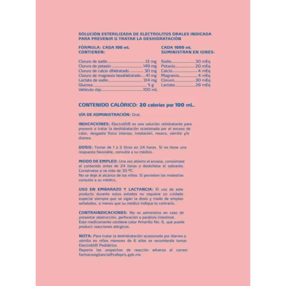 Electrolit es una solución rehidratante oral, para la prevención y el tratamiento del desequilibrio hidroelectrolítico ocasionado por el exceso de calor, ejercicio físico intenso, insolación, resaca, vómitos y diarrea. Está indicado para la prevención y tratamiento vía oral del desequilibrio hidroelectrolítico.
