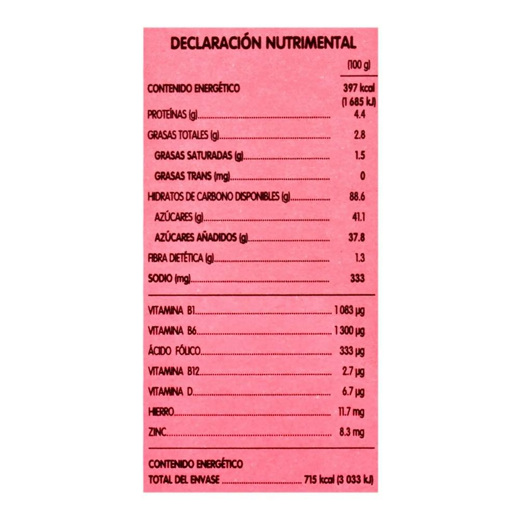 Es un cereal que les da a tus hijos una combinación de nutrición, sabor, aroma y color para un desayuno Frutidivertido. Está elaborado de 3 diferentes cereales: maíz, trigo y avena y además contiene sabores naturales a frutas. Está adicionado con 12 vitaminas y minerales para ayudar al desarrollo de tus hijos, una porción aporta el 100% de la recomendación diaria de vitamina C.