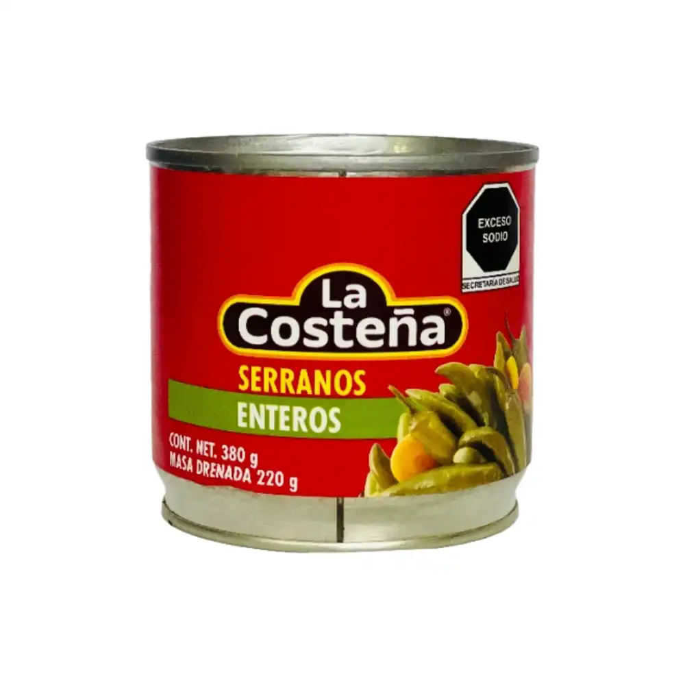 Lata de chiles serranos enteros en escabeche de 380 g de La Costeña®.
