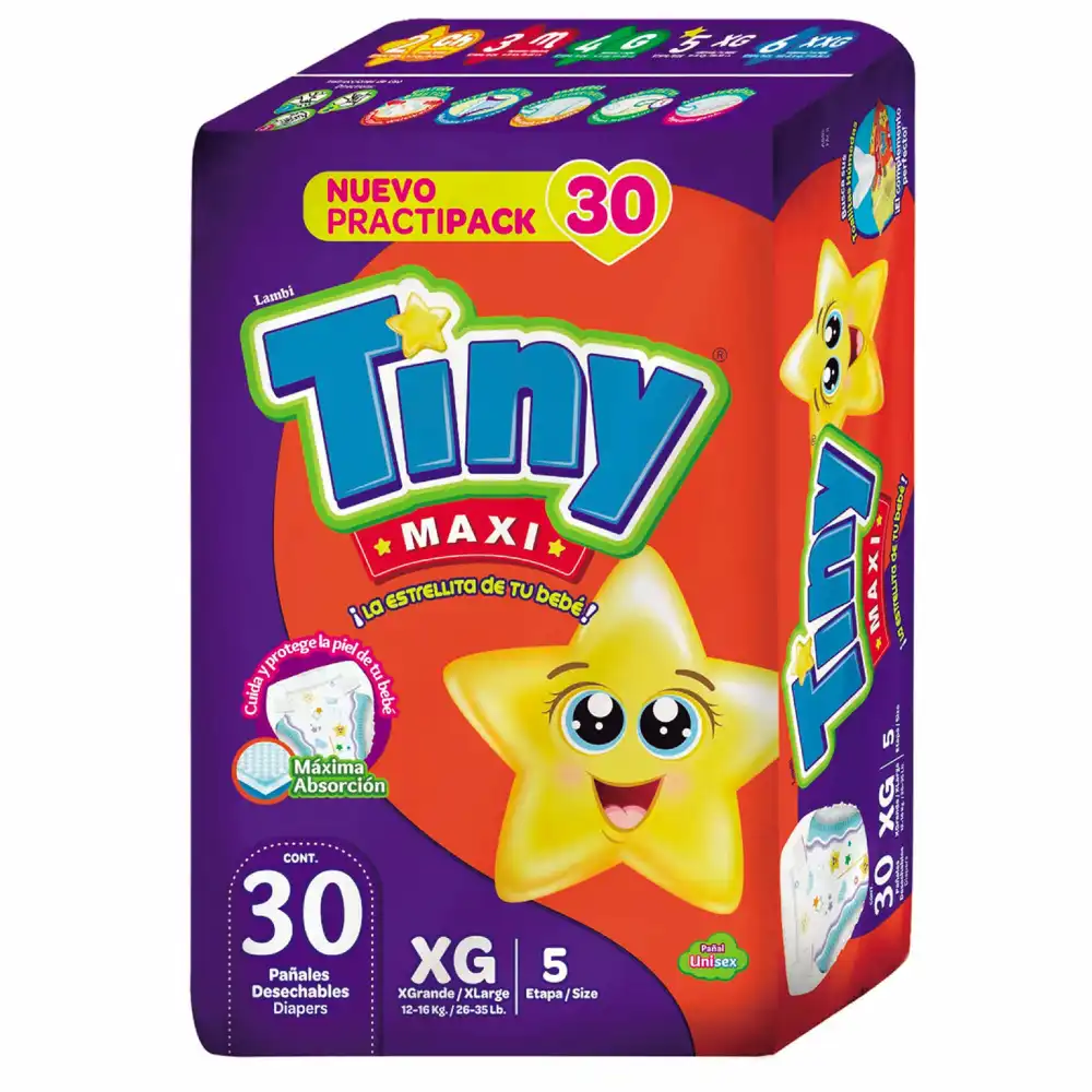 Tiny Maxi mantiene a tu bebé cómodo y protegido por más tiempo; es la marca de pañales para bebé que tiene los mejores atributos dentro de su segmento. Ahora con Cintura Elástica que da un ajuste perfecto y con sus Barreras Anti-Escurrimiento no más fugas. Su cubierta con Manzanilla, Aloe y Vitamina E mantiene la piel protegida y además el Cambiómetro nos dice cuando cambiarlo.